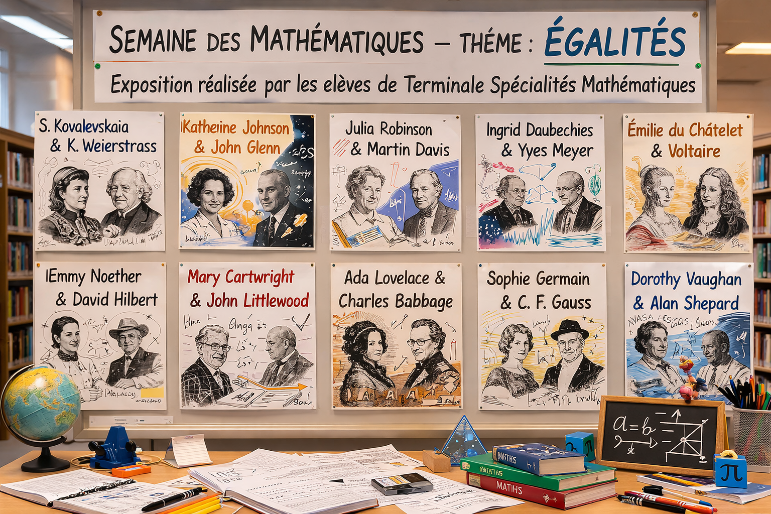 Dans le cadre de la semaine des mathématiques sous le thème "Égalités", le CDI accueille l'exposition réalisée par des élèves de terminale spécialisée mettant en avant des duos emblématiques ayant contribué de manière significative aux avancées mathématiques. L'exposition, ouverte jusqu'au 25 mars, sera également animée par des présentations d'élèves lors des portes ouvertes du lycée le 21 mars.