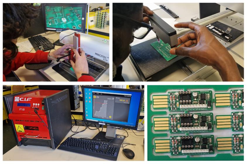 La formation se déroule dans des salles équipées de matériel identique à celui utilisé en entreprise : postes de soudure pour composants traditionnels et miniatures CMS, manipulateurs de composants CMS, four à refusion…